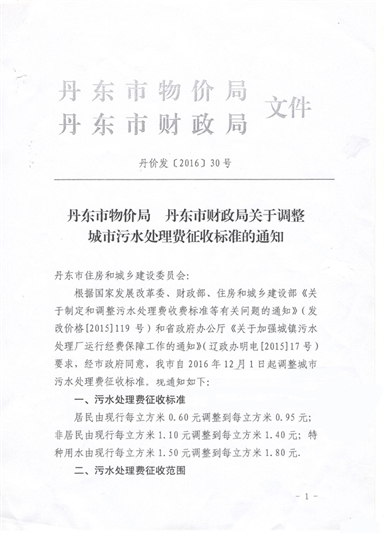 丹東市物價局 丹東市財政局關(guān)于調(diào)整城市污水處理費征收標準的通知2017-06-15