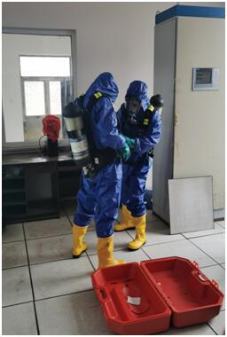 泄氯應(yīng)急操作演習(xí)事前并未提前通知相關(guān)人員,系人工觸動(dòng)泄氯報(bào)警裝置,警鈴響起后,三灣運(yùn)轉(zhuǎn)值班人員立即到達(dá)氯氣車間,泄氯回收裝置已自動(dòng)開啟,同時(shí)通知水廠和三灣凈化班組,穿著連體防護(hù)服并佩戴好壓縮空氣呼吸器,三灣凈化班組值班人員佩戴活性炭防護(hù)面罩到達(dá)氯氣車間參與應(yīng)急搶修。